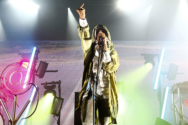 A chick DJ with a sweet side ponytail came on first, and a thick fog swept over us along with her intro beats to set the mood for about 10 minutes. And then a tiny woman wearing gold sparkly leggings, a giant jacket and a sort of Middle Eastern head covering bounded onto the stage … M.I.A. is simultaneously fierce and adorable. She had two male dancers alongside her for much of the concert, and the ginger kid looked strangely familiar.